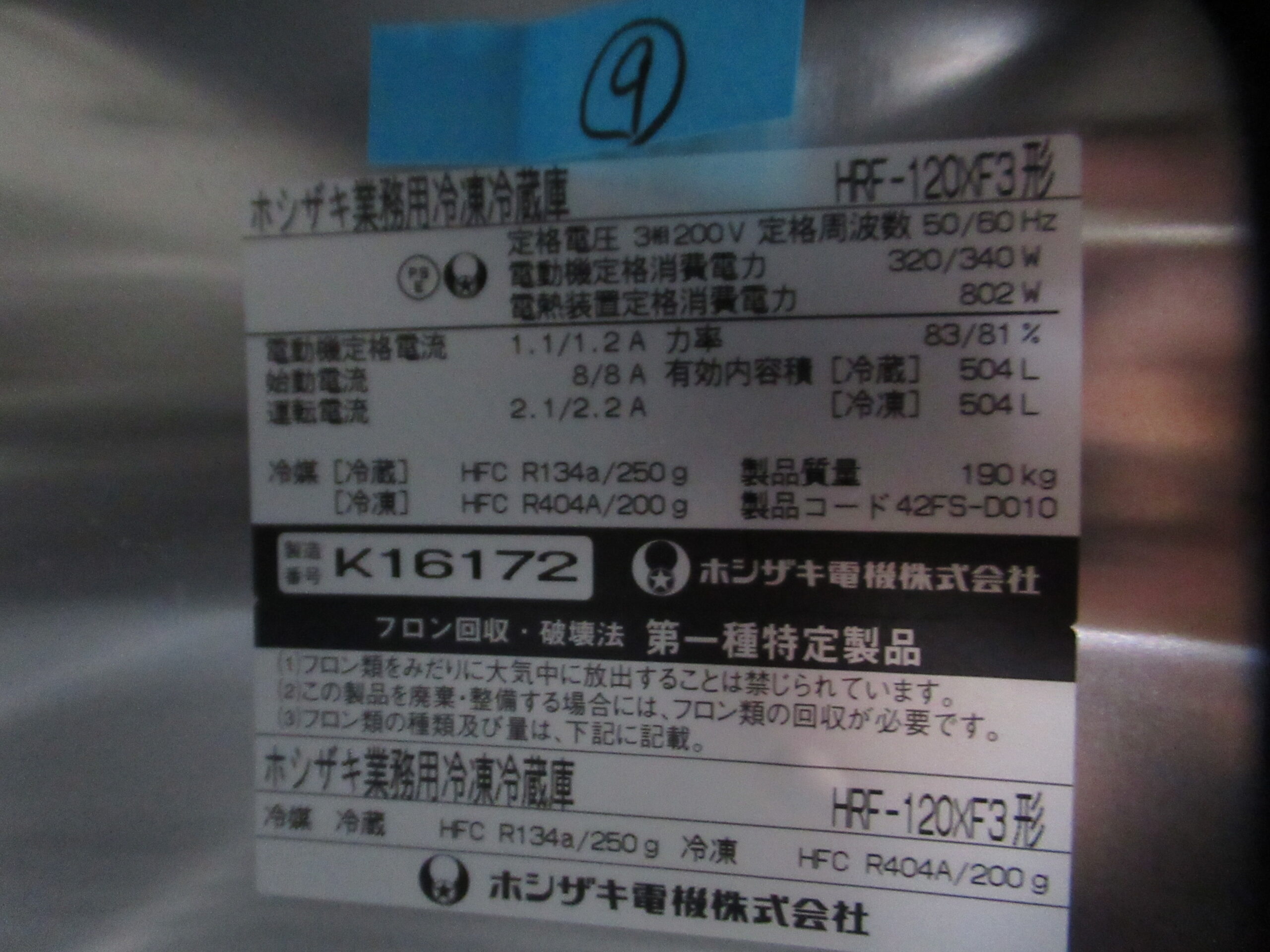 冷凍冷蔵庫(ホシザキ10製 冷蔵504L冷凍504L)